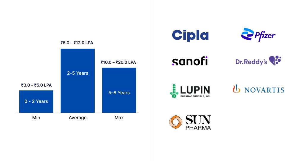 Graduates can pursue roles such as Pharmacovigilance Officer, Drug Safety Associate, Medical Writer, Regulatory Affairs Executive, or Regulatory Intelligence Analyst. Depending on experience, professionals can expect average packages ranging from ₹3.0 LPA to ₹20.0 LPA, with high growth potential across CROs, pharmaceutical MNCs, healthcare analytics, and regulatory firms.