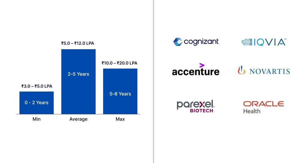 Graduates can pursue roles such as Clinical Research Associate / Coordinator, Clinical Data Manager / Analyst, Regulatory Affairs Associate, Healthcare Cybersecurity Analyst, or Cloud Health IT Specialist. Depending on experience and domain expertise, professionals can expect salaries ranging from ₹3.0 LPA to ₹20.0 LPA, with excellent growth opportunities across CROs, pharma companies, and healthcare technology firms.
