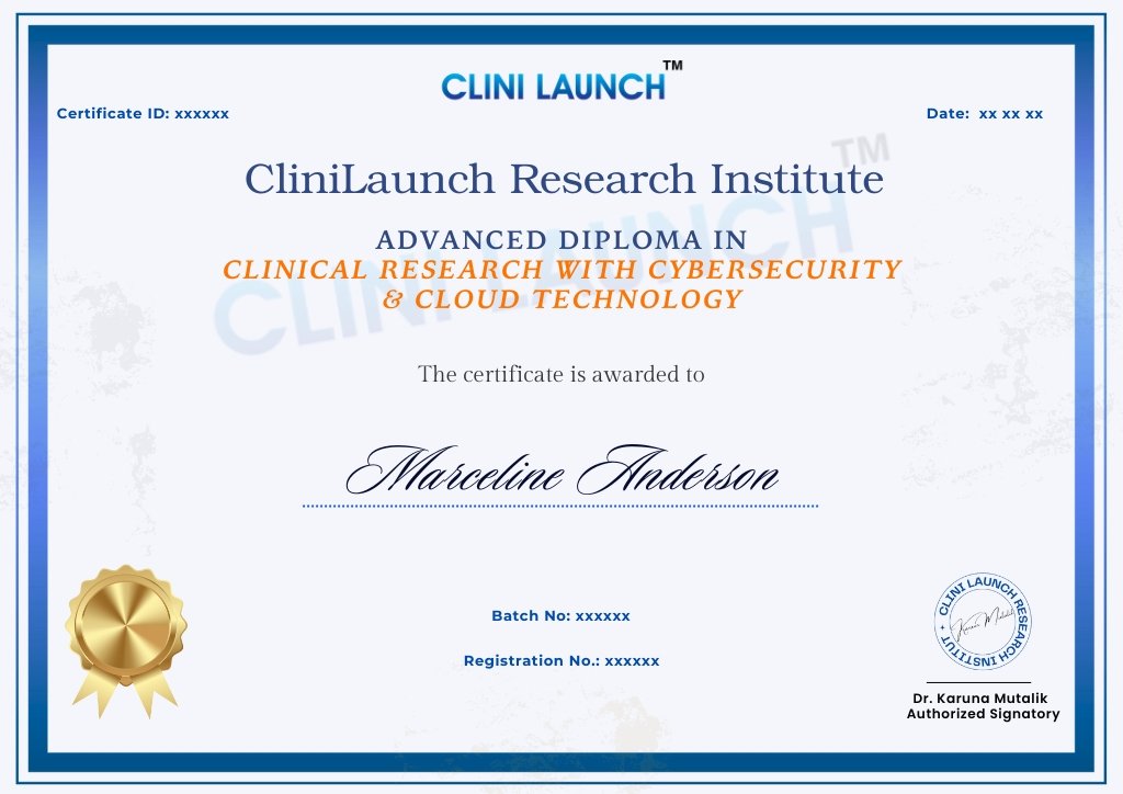 Upon successful completion, learners receive the Advanced Diploma in Clinical Research, Cybersecurity & Cloud Technology + IBM, awarded by CliniLaunch Research Institute (CLRI). The certification validates practical skills in clinical trial design, data security, cloud deployment, and digital compliance management.