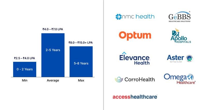 Graduates can move into roles such as Medical Coder, AI QA Specialist, HCC Analyst, CDI Specialist, or RCM / Revenue Intelligence Analyst. This medical coding certification with placement support helps learners transition into specialized roles as well. Salary typically ranges from ₹2.5–4.0 LPA at entry level to ₹8–15 LPA+ with specialization and experience, including opportunities in India, UAE, and US remote markets.