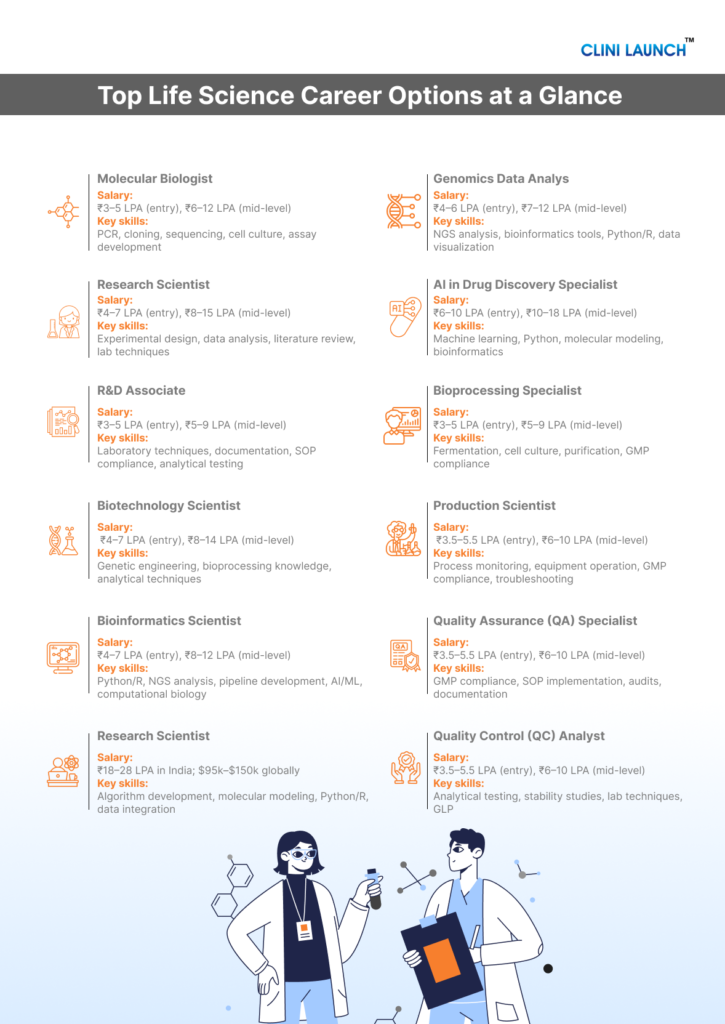 Roles in clinical research, data analytics, bioinformatics, pharmacovigilance, and regulatory affairs are among the most in-demand and offer strong growth and global opportunities.