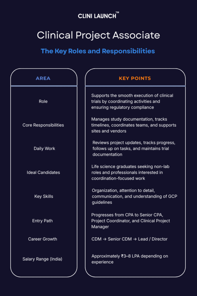 A Clinical Project Associate (CPA) supports clinical trial operations by managing study documentation, coordinating project activities, supporting sites and vendors, and ensuring compliance with GCP and regulatory standards. The role serves as an entry point into clinical research operations and project management.