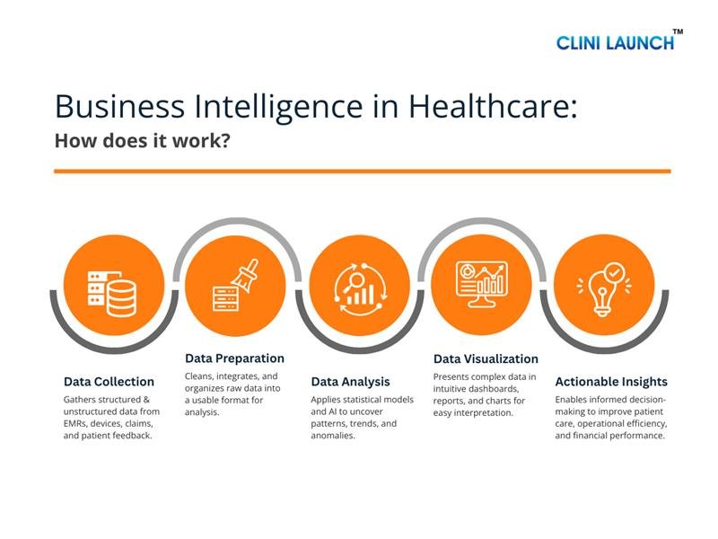 It starts with collecting data from EHRs, lab systems, billing platforms, medical devices, and external databases. This data is then cleaned and organized in a central warehouse or cloud platform. Next, BI tools analyze the information to uncover trends, measure performance, and support predictions. Finally, the insights are displayed through dashboards and reports that help healthcare teams make informed decisions. Here’s how it works: