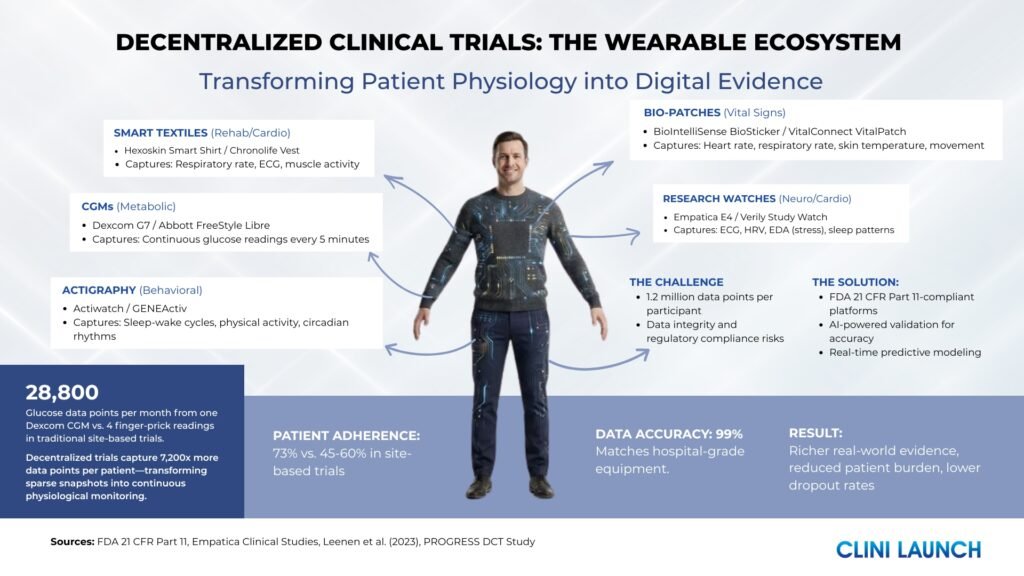 A key advantage of wearables in DCTs is predictive modeling. With AI algorithms, real-time data from CGMs can be used to assess treatment efficacy and adjust protocols dynamically. Similarly, activity trackers provide insights into exercise interventions in cardiovascular trials, offering real-world data that traditional site-based methods can’t match.