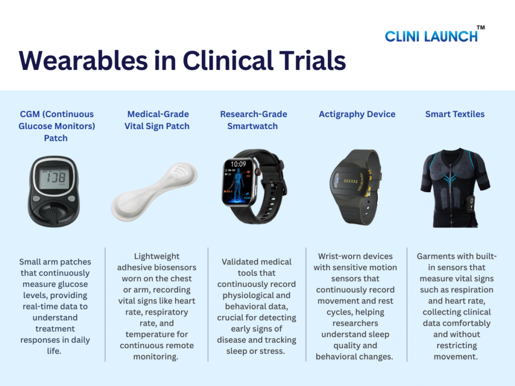 Wearables in clinical trials are transforming the landscape of clinical trials by enabling continuous, real-time data collection from patients outside of traditional clinical settings. These devices are worn by participants to monitor a wide range of physiological and behavioral data in their everyday environment. Below are five wearable devices that are increasingly being used in clinical research: